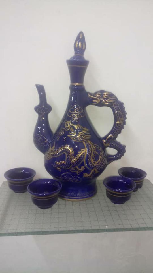 Vendo jarra china estilo Ming con dragón azul y dorado con sus tazas en 80 usd me puede localizar al 52000588