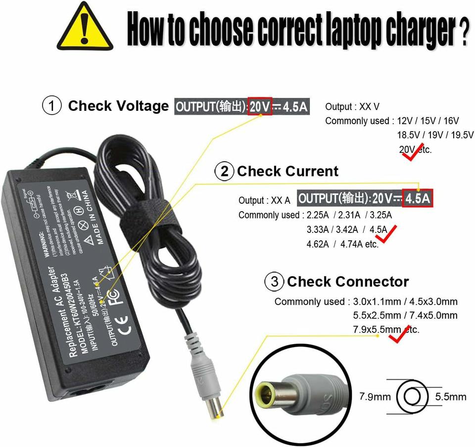 Especificaciones: salida CC 20 V 4,5 A, entrada 100-240 V 50-60 Hz, potencia 90 W, tamaño del conector: 0.311 x 0.217 in (punta redonda), 3 clavijas, color negro, estado nuevo, peso alrededor de 0,75 libras, el paquete incluye 1 adaptador de CA de repuesto, 1 cable de alimentación CC. Para elegir el cargador de CA correcto, es importante comprobar tu adaptador antiguo antes de averiguar estas características (salida, entrada, tamaño del conector, etc.)