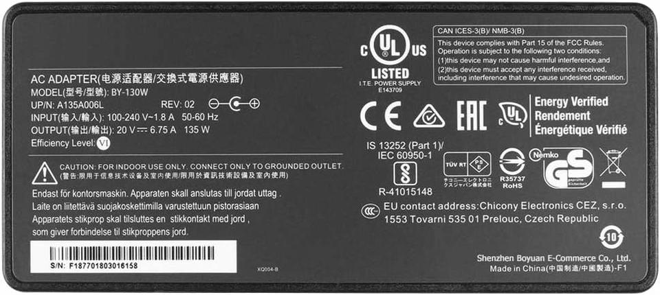 Especificaciones del producto]Entrada: 100-240 V 50/60 Hz, Salida: 20 V 6,75 A 135 W, Potencia máxima de salida: 135 W. Color: negro, Tamaño del conector: 5,5 x 2,5 mm.