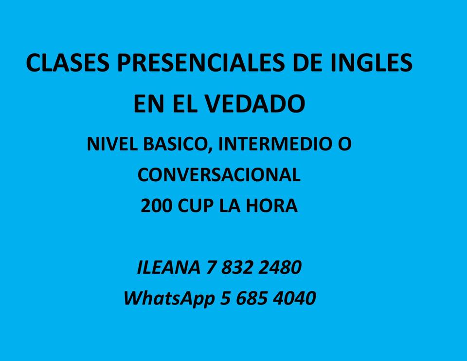 Se imparten en el Vedado clases de Inglés personalizadas individuales o para grupos pequeños; niveles Básico (A1, A2) o Intermedio (B1, B2), también conversacional según necesidades del o los clientes que van a recibirlas. El lugar, frecuencia, días de semana y horario de clases se acuerdan entre las partes. La tarifa a pagar es de 200 Pesos cubanos (CUP) por hora de clase.