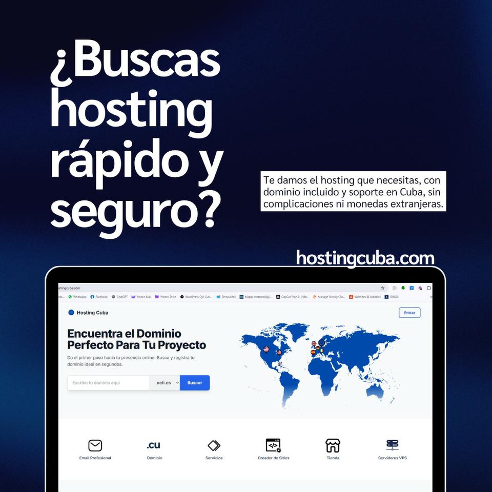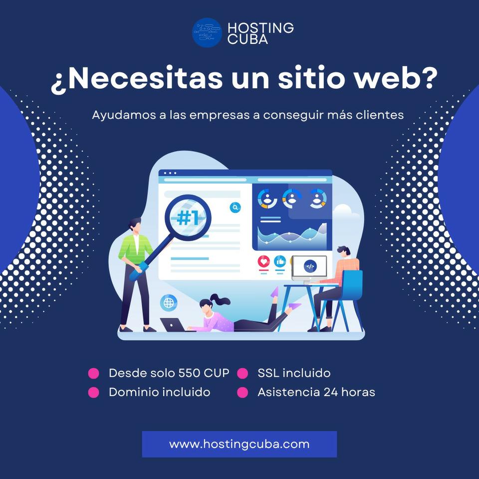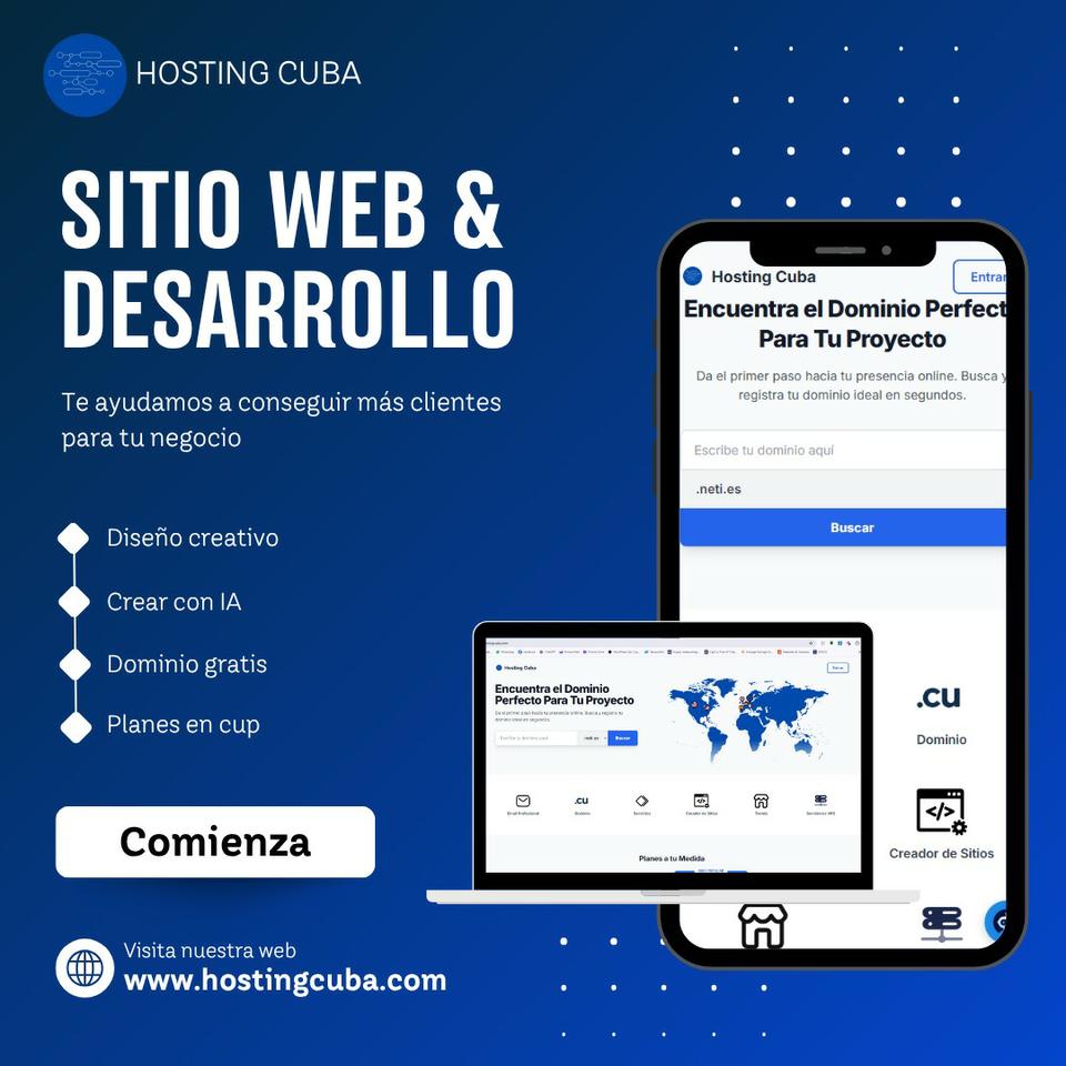 En Hosting Cuba te ayudamos a conseguir más clientes para tu negocio con sitios web modernos y creativos. Creamos páginas con inteligencia artificial, te incluimos el dominio gratis y ofrecemos planes en CUP para que todo sea más fácil. Si quieres dar el primer paso hacia tu presencia online, entra a nuestra web y comienza hoy mismo: www.hostingcuba.com