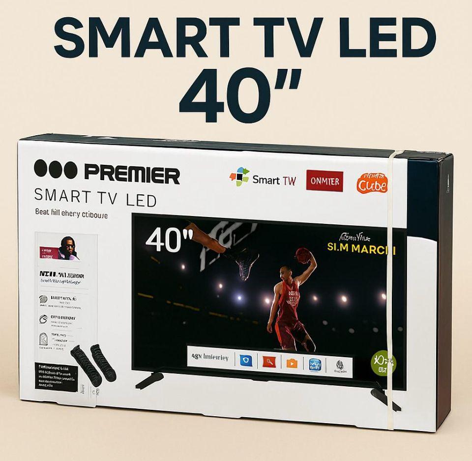 Oferta de smart tv marca Premier, 40 pulgadas, viene con 2 controles remotos, 1 caja decodificadora y el soporte para ajustar a la pared.